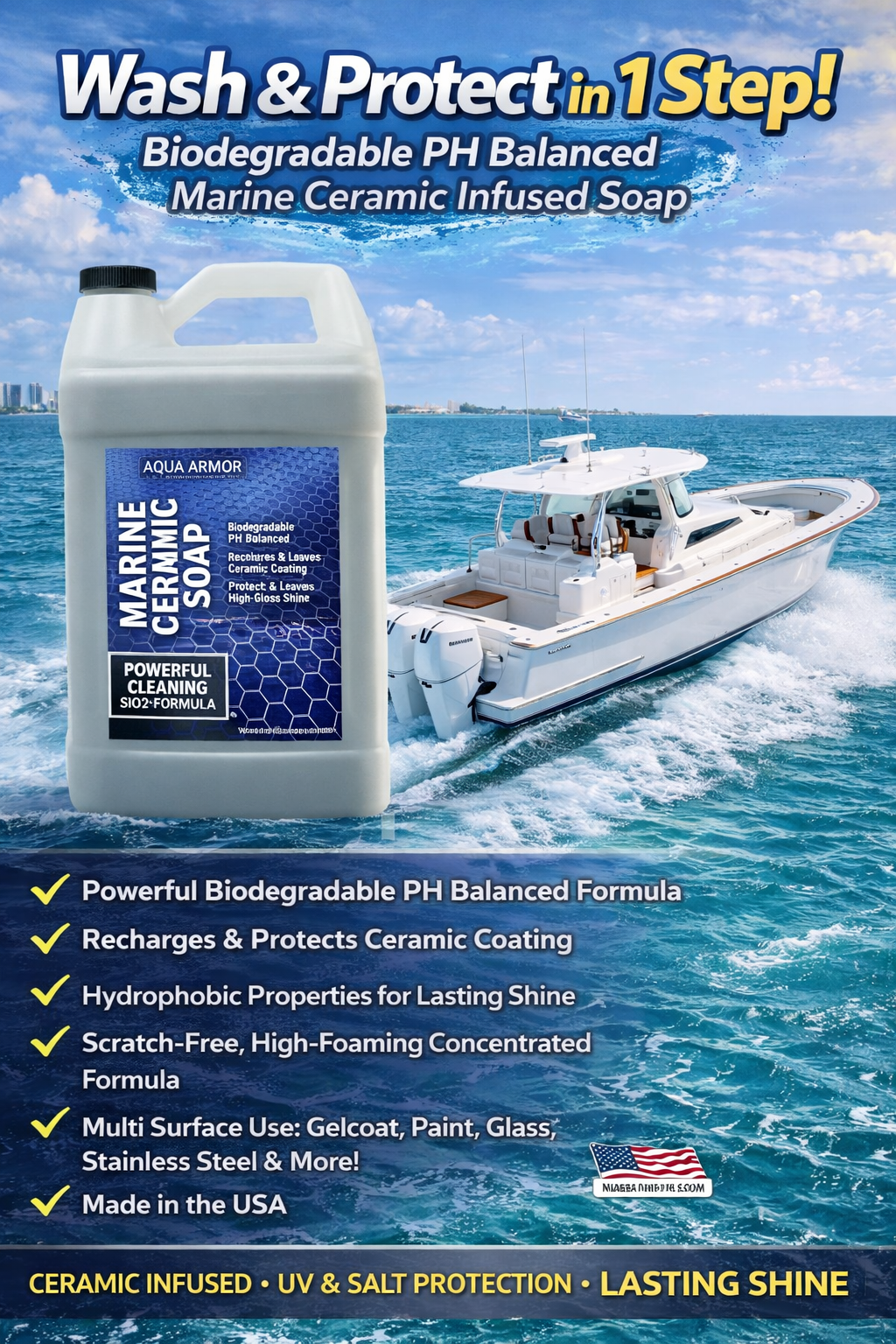 Aqua Armor Marine Ceramic Infused Soap is a powerful, pH-balanced marine soap formulated with biodegradable surfactants to keep your boat clean, protected, and looking its best. Infused with SiO₂, this advanced formula leaves behind a thin ceramic layer that helps protect surfaces from UV exposure, salt, and everyday marine contaminants.